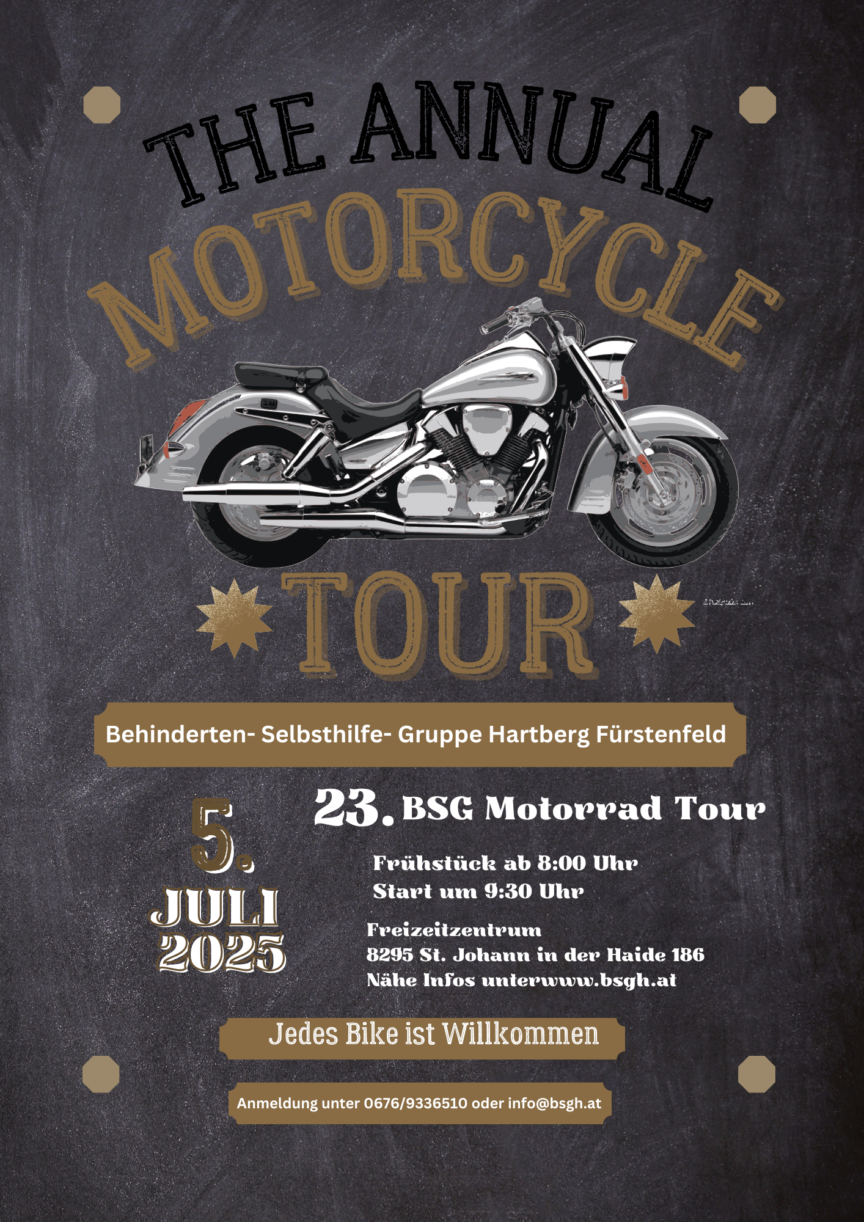 Liebe Community der Behinderten-Selbsthilfe Gruppe, wir freuen uns, euch zu unserer 23. BSG Motorradtour einzuladen, die speziell für Menschen mit Behinderung organisiert wird! Datum: 05.07.2025 Uhrzeit: 08:00 Uhr Treffpunkt: Sportplatz St. Johann in der Haide Streckenlänge: ca. 120 km Was erwartet euch? Eine geführte Motorradtour durch wunderschöne Landschaften Leckere Verpflegung Coole Bikes, Cabrios und Sportliche…