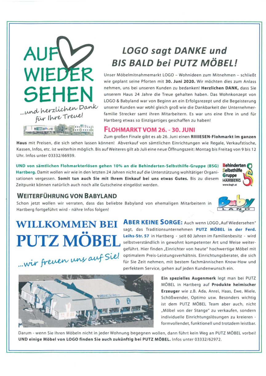 Das BSG Team bedankt sich herzlichst bei der Fam. Strecker LOGO für die jahrelange Unterstützung! Liebe Freunde und Mitglieder der BSG Hartberg! Es würde uns und die Fa. Logo sehr freuen, wenn Ihr vom 26.-30 Juni beim Flohmarkt vorbei schaut. Ihr würdet damit auch die Behinderten-Selbsthilfe-Gruppe (BSG) unterstützen. Viel Spaß bei der Schnäppchenjagd! Liebe Grüße…